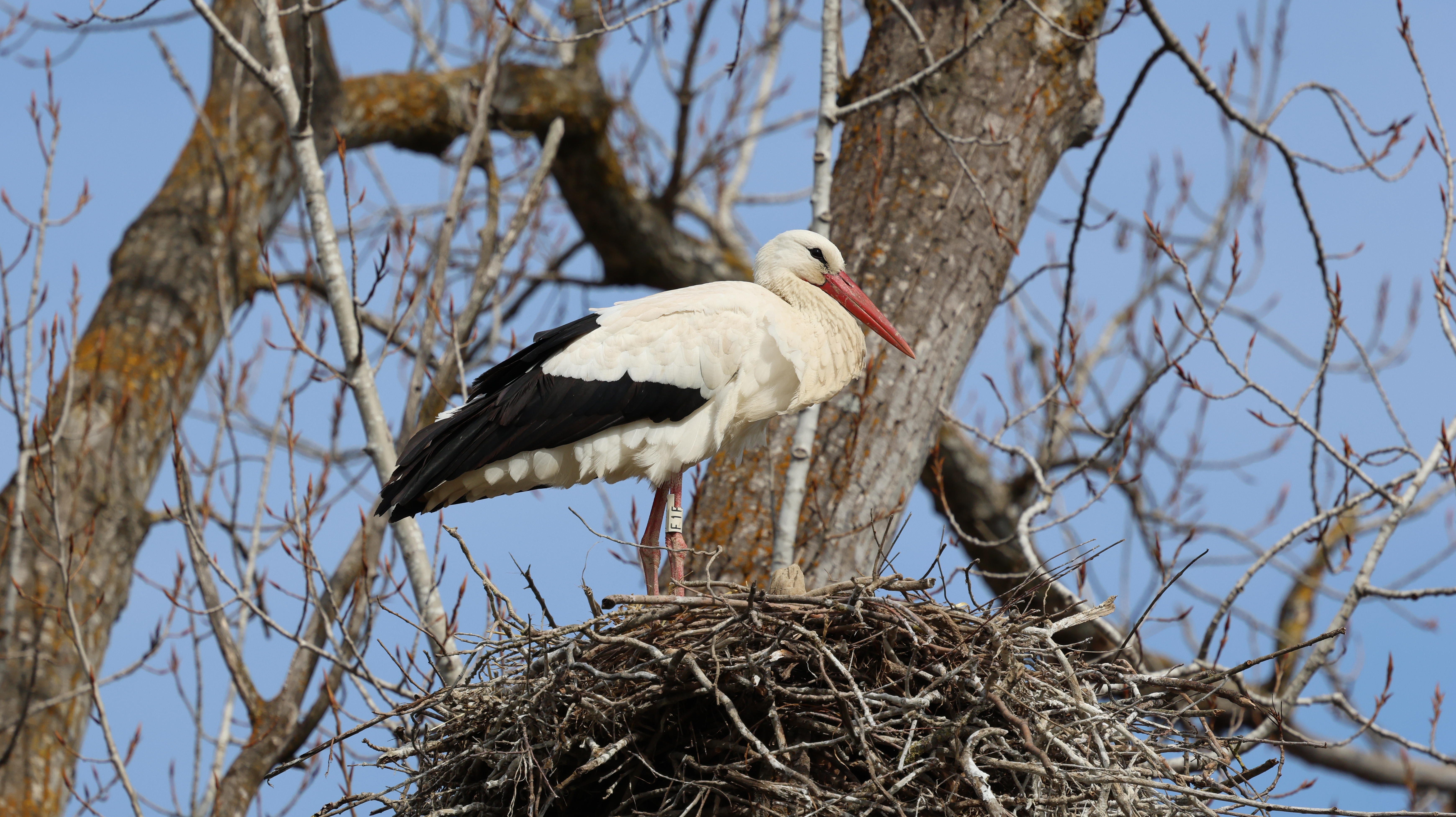 Cigüeña blanca (Ciconia ciconia) en su nido elevado sobre un árbol desnudo. Marcada con anila [F1F3]. |